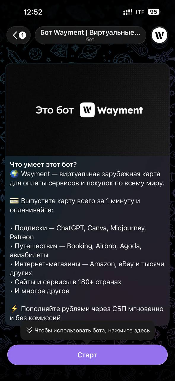 1. Перейдите в [Telegram-бот **Wayment**](https://t.me/WaymentBot) [**@**&#x77;aymentbot](https://t.me/WaymentBot)